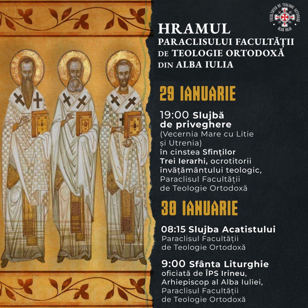 Facultatea de Teologie Ortodoxă din Alba Iulia își cinstește hramul în zilele de 29 și 30 ianuarie 2026, prăznuindu-i pe Sfinții Trei Ierarhi: Vasile cel Mare, Grigorie Teologul și Ioan Gură de Aur, ocrotitorii învățământului teologic.